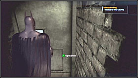 Proceed to your right and make sure that you're still using your detective mode. Find a weak section of the wall (screenshot #1), choose the explosive gel from your inventory and apply the gel by pressing the action key. You must now detonate the gel, unlocking a nearby passageway. Find a door leading to Arkham West.
