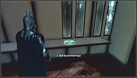 Explore the southern section of the records room to find a grating on the wall. Use the Batclaw to rip it off and then use the hook to gain access to a nearby room. When you find yourself standing on a balcony drop down and look for the tape (it's on the table).