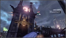Now you can search for the point marked as Advanced AR Training 2 #1. It can be found in the Bowery, in the south-west part of Arkham City. After getting there look for the Gotham Bank building #2. You need to reach one of the gargoyles.