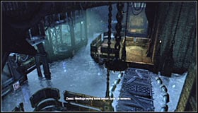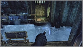 Theoretically it could seem that Batman should avoid Zsasz's sight, but he will probably be so occupied with his hostages that it won't be really necessary. Get out of the shaft #1 and head forward. Stop by the ledge and wait a couple seconds to note, that the water level keeps changing. Wait for it to come up and cross the bridge #2.