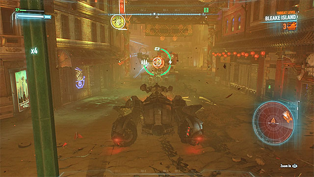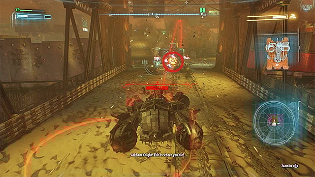 Final part of the duel with Arkham Knight is also very challenging. This time you won't need to hide because you will no longer aim at any Cloudburst tank weakpoints. Instead, you will attack its central mechanism which has been marked on the picture above. Before you start attacking enemy vehicle, wait until it appears on one of the island's main streets - it is very important to have a large area of operation. Position yourself quite far from the tank and start attacking its "core" with 60mm cannon. Of course, enemy won't be helpless. Most of all, avoid its missiles by dodging the red circles appearing on the ground. Additionally, use Vulcan cannon to destroy the rockets shot at Batmobile.