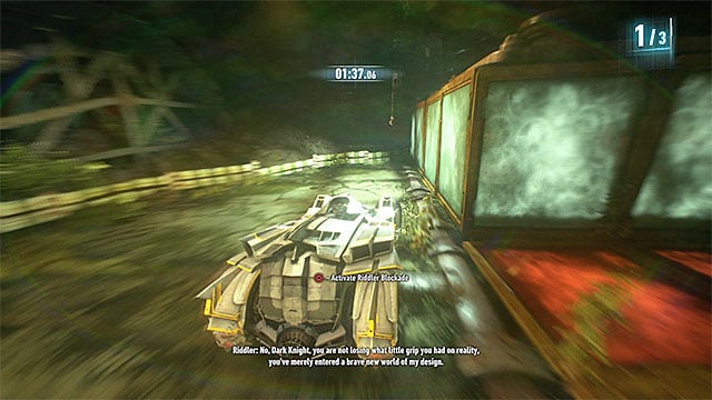 If you still have not completed the Own the Roads side mission, it will be possible to drive into the garage only after you have neutralized the militia outpost here. Use the batmobile to knock out all of the opponents, find the leader (it is a good idea to use the detective mode here) and smash the controlling device that you find on him. Only after that, can you drive into the elevator, through the garage gate, and wait until you get to the location of the trial proper.