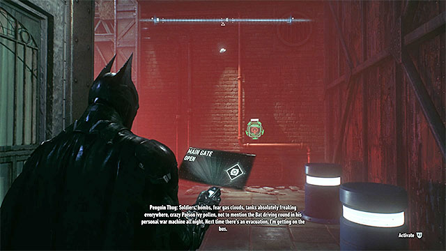 Contact Nightwing, who gives you directions towards the van parked near the Salvation Bridge. Use the disruptor to plant the tracking device and, after it starts escaping, follow it. Penguin's men go to sewage treatment plant in Chinatown on Bleake Island. Approach the locked gate of the plant and contact Alfred, who suggests an alternative access route through the sewers. Call the batmobile and follow the markings on the ground. This way, you will get to the entrance to the sewers, not too far away Southwards from Penguin's hideout.