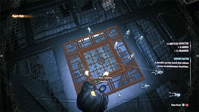 After you get above the bandits, stand next to one of the grates. It is best to start the fights with fear takedowns. You need to watch out here, because Nightwing is not going to help you out and some of the opponents (e.g. the ones with stun guns) require specific attacks.