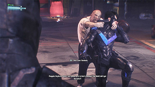 After the fight, enter the vault here. Apply explosive gel to the weapons. After you exit the vault, you notice Penguin holding Nightwing. There is no special action that you need to perform here. Just wait until you can use team attack. After a short struggle, you can detonate the gel.
