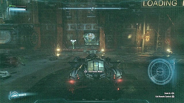 Open the gadget menu and select Batmobile Remote Control. Locate an interactive object and use the Winch. Use reverse to raise the ramp. Head straight onto the ramp and use the Afterburner to make it to the factory main square. Deal with the tanks and remember to slide all the time, which will allow you to avoid enemy attacks (red beams).