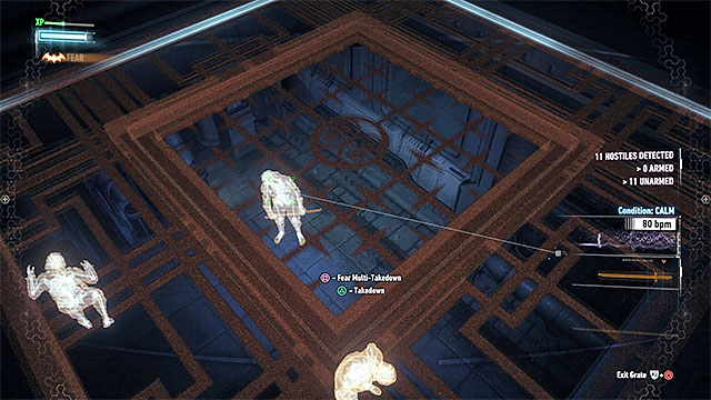When the elevator reaches the bottom, take control over Batman and enter a new area in the factory. Use the grapnel to pull yourself to the hatch in the roof and start going through the ventilation shaft. Stop when you reach a room with several enemies. It is best to start the fight from Fear Multi-Takedown. Focus on the medic in the white suit. You can use objects from the environment to eliminate the enemies, but it is not necessary.