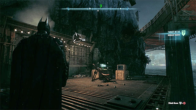 Almost immediately after starting following the question marks you must jump down from the upper ledge. Slowly move forward through some small tunnels. The question marks will lead you to the round green sign under the bridge. Shoot it to destroy part of the bridge. Now leave the Batmobile and catch the trophy with the batclaw.