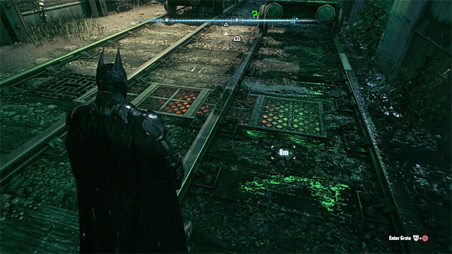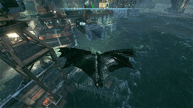 Carefully ride through the roofs (you can help yourself by switching to Batmobile's combat mode). Stop once you reach the place shown on the picture above. Use Batmobile's winch on the hook on the left from the glowing button. Go towards the hook and, when Batmobile will be in horizontal position, pull yourself to it. Now you can drive to the glowing button and activate the forensic scanner. Green question marks will start appearing nearby.