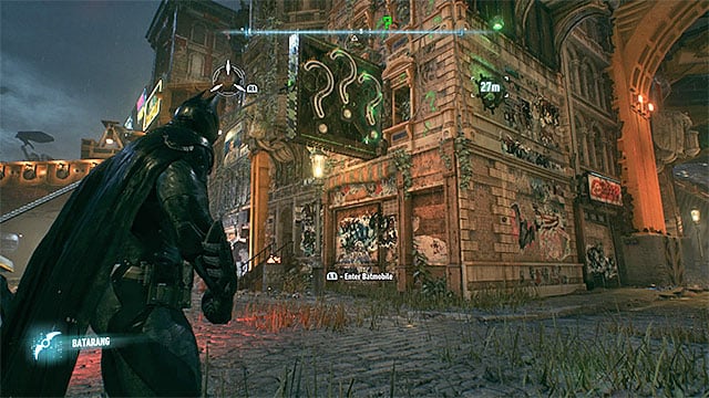 Once you reach the upper level, summon the Batmobile, activate the forensic scanner again and resume following the green question marks. They will lead you to a building with a round green mark on its wall. Use the cannon to shoot that spot. You will destroy the weakened wall. Now you can reach the trophy.