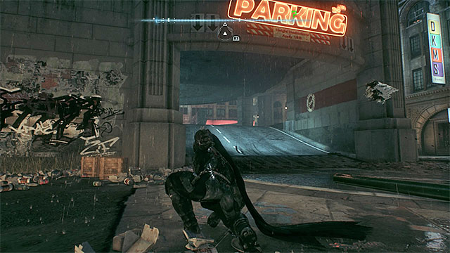 Trophy walkthrough: The trophy is located in a small cage on the roof. Obtaining access to it is hard. The cage is powered by a fuse box to which you must connect the Batmobile. It means that you must get the vehicle to the roofs. Go south from the secret and find the multi-level parking shown on the picture above. Enter the Batmobile and drive to the highest level of the parking.