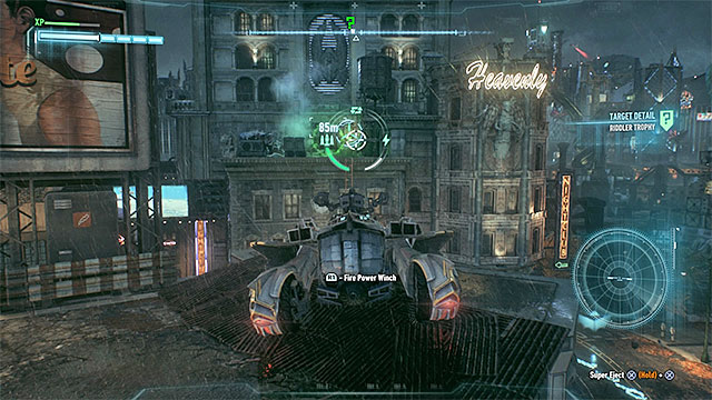 There's a jump on the highest level of the parking. You must use it to reach the neighboring roof (help yourself with the afterburner). After that, position your vehicle in a way shown on the picture above. Use the winch from the distance and load the box (the Batmobile's engine RPM pointer must remain in the orange zone). Now all that's left is to capture the trophy with the claw.