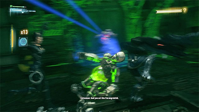 Keep fighting up until the Catwoman appears. From now on, things are going to be easier. As Batman, attack the blue robots and the red ones as the Catwoman. You need to be careful, because the Riddler will occasionally change which robots should be attacked by whom so, do not attack blindly. To eliminate the robots quickly, use team attacks, especially that you get the option to do This quite often.