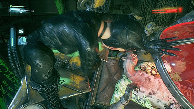 Your objective is to bring about the situation, in which all of the bodyguards are neutralized. Wait for the Riddler's machine to hit the ground and run up to him from the frontal side. Press the standard attack key/button for your character to jump onto the machine. Keep pressing the attack key for Batman to deal damage to the Riddler, which deprives him of a third of his health.