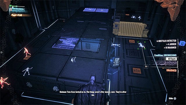 Two-Face, together with a new group of bandits, will show up after you've stopped the bank robbery. Ignore the main enemy at first and focus on his subordinates. Don't try to use the detective mode here, as your enemies have devices that can block it and that can detect the attempt to use it. Firstly get rid of the medics and then neutralize the enemies as you wish. Try to attack from the hiding place by using silent takedowns and use the observation points and ventilation shafts.
