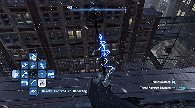 After you reach the region of the locked box with the collectible, climb onto the balustrade and turn towards the discharges shown in the screenshot. Throw the remote controlled batarang and make sure that it is charged. Turn the batarang back and direct it towards the fuse box located above the collectible. You can now collect the Datapack from the box you have just opened.