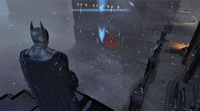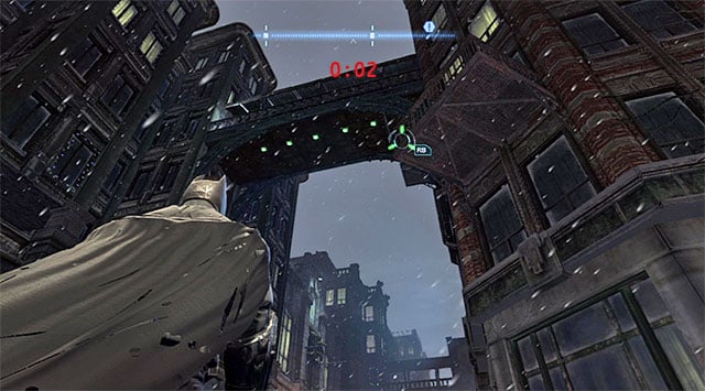 Start on the rooftop of one of the buildings to the North-East of the collectible and glide towards the interactive button shown in the screenshot. In the mid-flight, hold down the attack button and plan the flight in a way that allows Batman reach the button on the wall. If you have done everything correctly, Batman should lean against the wall for a moment. For a fraction of second, release the flight button and press it again, thanks to which your character will bounce off the wall. Land quickly and use the claw to collect the Datapack from the box, before time runs out. .