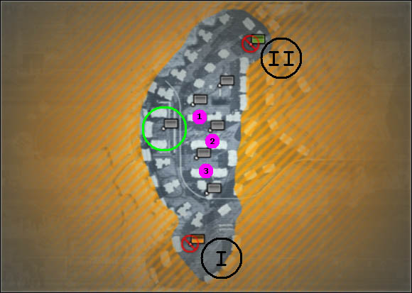 Analysis: Let's start from the hill in the west part of the map. It is marked with a green circle in the picture above. It's a key place because of the flag placed on the top of it. From there, attacking spawns in the east is really easy, because the distance isn't long and team may provide constant inflow of reinforcements. Besides, hill may be a vantage point and the flag provides a battlewalker, if captured. It is also worth saying that only infantry can take this spawn, vehicles cannot access it. Other flags are placed among blocks of flats marked with [1], [2] and [3]. These buildings have balconies that may be used by snipers and engineers in order to defend or attack nearly placed spawns. EU and PAC have got their main bases in points [I] and [II]. Each side has one tank and one APC. Moreover, fast and versatile recon vehicles may be found there too.
