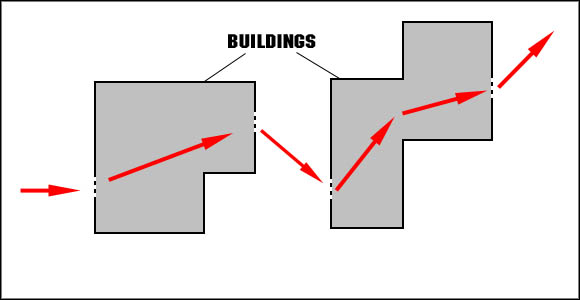 The attackers - in search for the best way to the gold crates - should walk through every building on their way. Most of the houses on the map are placed in a specific way, so they can easily enter the structures through one door and get out through another (located near the defenders). Sometimes it is possible to get through a series of buildings, which not only allows to get close to the crates without being spotted, but also protects from the artillery strikes.
