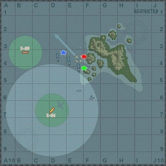 ![]() | Units at your disposal: two Japanese submarines I-25 and I-26 Enemy: American aircraft carrier USS "Enterprise", light cruiser, two destroyers, patrol boats, seaplane PBY Catalina and torpedo planes Avengers armed with depth charges Level of difficulty: 4 (6 with hidden objective) |