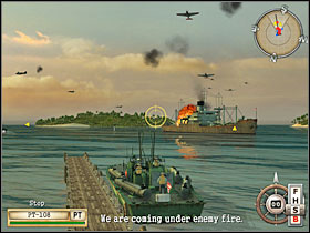 However, your main task here, in the open sea, is to destroy all Japanese landing crafts (2) (these smallest boats). The Japanese must not land more than five boats (2). Furthermore, you should also sink two landing ships (2) (those of medium size) and transport ships (3) (the biggest ships in number of three). One of your hidden objectives is also to send to the bottom Japanese destroyer from the escort (1). First, take care of these smallest boats fully loaded with Japs and quickly pushing to the island - you can destroy them efficiently and spectacularly using even your machineguns, zooming in the view with middle-mouse button if necessary. [#7] Though, watch out at what you're firing because there are other American PT boats operating in this area and they can be easily mistaken with the enemy. After completely destroying the first wave of landing boats (*) (this is secondary objective) you'll be able to use the torpedos your patrol boat is also armed with. Switch to them by pressing Shift key. Launch one torpedo at each landing ship of medium size (LST Landing Ship) transporting Japanese tanks and vehicles - this should be enough to send them to the coral. [#8] Fire your torpedoes from minimal range to not give the enemy a possibility of avoiding them.