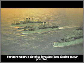 You can sail without any fear very close to the Japanese destroyer assuring the invasion forces (he's nearby) and sink him with two torpedos. [#9] Finally take care of three enemy cargo ships (these biggest in light painting) launching on the water those smallest boats you've been destroying earlier (and now do the same if you see'em again). Fire to torpedos at each of these cargo ships to stop them from launching those boats. [#10]