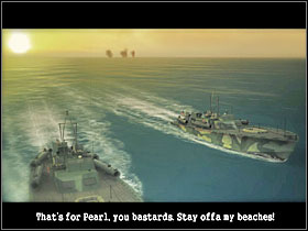 If you want to complete one of hidden objectives concentrate on enemy bombers - shoot down at least five level bombers G4M "Betty-II" (2) flying on high altitude. Take an adjustment on their movement while aiming at them and shoot using your .50 machineguns - don't bother to aim at their engines as game suggested during the scenario loading. Shoot using the external view when enemy bombers fly by close, use your binoculars and zoom in your view when they're far. [#3] When your sailor has managed to turn on the engine head on to the open sea, in the direction of one of these yellow triangles you see on picture [#2]. It's time to repel the enemy invasion on the island. [#4] There's no sense in sitting here, in the harbor, because Japanese aircrafts will finally target even your small patrol boat.
