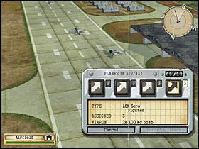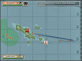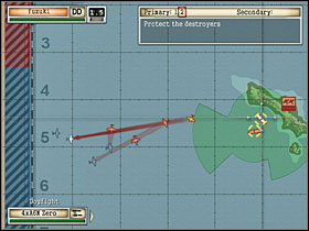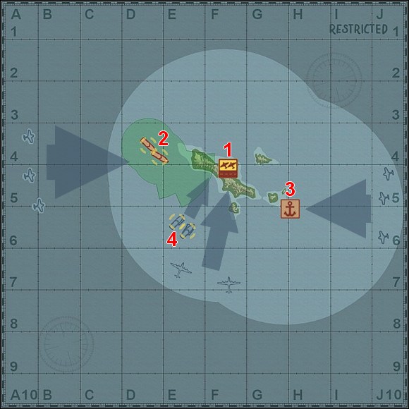 When game displays a message that there's left only one, last flight of enemy bombers to shoot down, leave that task for two your flights and send rest of your aircrafts west, to the edge of a map. When bombers are gone, quickly send also these last two flights of your planes to the west edge of a map. If you know that you have sustained losses during the dogfight with American bombers, quickly switch to the airfield (cycling with Tab key works best for me) and take-off with next fighters, armed with bombs (this weapon will be very useful later) - you must have max. number of planes in the air and necessarily in four flights! After destroying enemy B-17s you'll see on the waters near the island two Japanese (so yours) destroyers, and in the air - successive flights of American planes (torpedo and dive bombers this time) approaching from west. Try to attack them as early as you can, I mean - near the left (west) edge of a map. Engage simultaneously as many as possible - every your flight dogfights with one enemy flight. The Americans have now an intention to sink both Japanese destroyers and you must protect these warships (2). [#3] Unfortunately you can't control these ships. You'll see a dozen or so groups of enemy planes - game all the time displays how many these flights (trios) left (after destroying each of them). And now starts the most difficult phase of a gameplay. At the moment when you see on screen a massage telling you that there's left only one (last) flight of enemy planes, attack him with only one yours. It's best to use such a small one (even consisting of one plane, literally) and additionally - the most advanced to the west one. Send rest of your aircrafts (these closer to the airfield and jetty buildings located further to the right (east)) towards the mentioned jetty buildings and even farther - to the right (east) edge of a map. If both Japanese destroyers are in good condition (almost free from damages) you can even risk leaving them without care and send all your flights to the east. And you can do it even earlier, when game informs you that there's left three flights of enemy planes trying to sink your warships. In spite of all, if the destroyers are in good state, they should survive. Or at least one of them - and that will do. Because now you must have your planes as close as possible to the right (east) edge of a map - since you'll see there next hordes (waves) of enemy planes, flying towards the jetty buildings to bombard and destroy these installations. You must protect the jetty buildings (3) now. If you have in the air four own flights of planes but incomplete (so you haven't got a max. number of planes in fact), then crash into the ground or ocean (yes, that's right!) the one which consists of only one plane and immediately take-off from the airfield with next planes (after such a kamikadze action you should have a place for one unit there) to fill gaps. Remember, you must always have in the air max. number of planes and in max. number of units. [#4] Thus, four flights - that's the key to success. Sorry for repeating this sentence 3rd time, but it's very important. Otherwise you won't complete this scenario, even if you're the best pilot in the world!