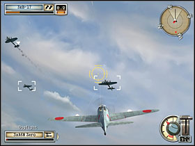 This scenario probably seems very difficult and finishing it almost impossible for some of you, because of hordes of enemies you must repel but... trust me, this mission can be completed. Take-off from your airfield with 4 flights (3 planes in each) of "Zero" fighters, armed additionally with bombs. You must have max. number of aircrafts in the air, but also in max. number of units, because you will have to face to many enemies and you should simultaneously attack as many of them as possible. [#1] After the take-off proceed with all of your planes to the south, to shoot down successive flights of enemy B-17 "Flying Fortress"bombers, systematically oncoming over your airfield from the south with an intention to bombard it. Your first task is to protect that airfield from destroying (1). These bombers always appear in two flights (3 planes in each) - I mean every wave of them consists of two such flights. You will see a few such pairs of flights (unfortunately I don't remember exactly how many, but mathematics prompts me that 4 :-)), approaching in short time intervals. After shooting down first ones focus on next. After sending to the ground every group of enemy planes, game displays a message, telling you how many squadrons (as a matter of facts these are flights) of them you have to take down yet. Attack every flight of bombers with two own. Start firing at them when you're already approaching them frontally, aim at the engines. It's also good to engage them at different angles - from below, top, side and behind finally. [#2] For the present, you shouldn't have bigger problems.