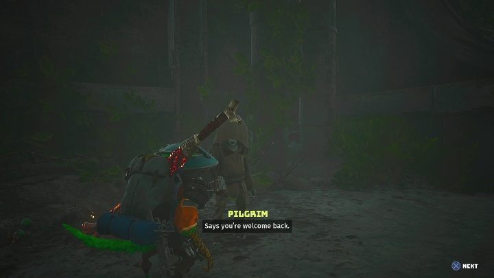 After getting the information, head south. The totem will be just by the main road. The pilgrim will appear next to you once you're near the totem.