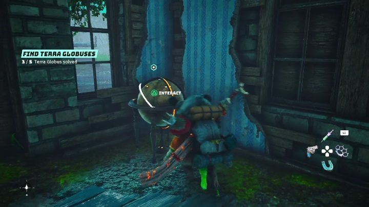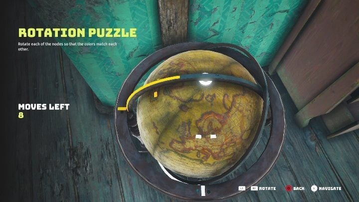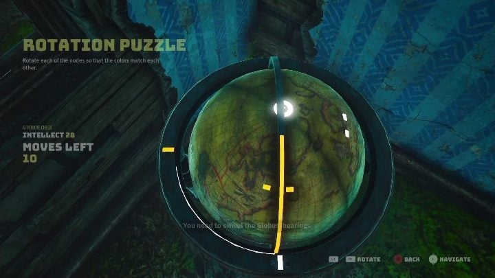 The globe is inside a white, dilapidated building. Position the globe so that the colors of all the three elements match each other. This way you will complete this part of the quest and you'll be able to proceed to the next part.