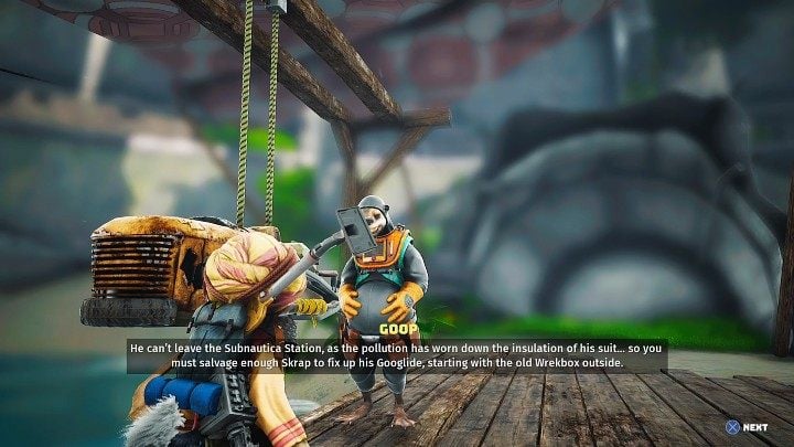 Goop will tell you a bit about the main character's past, but also about his Googlide and how the jet ski he built can help you fight Porky Puff. Unfortunately, Goop is missing parts to get his invention up and running. Unfortunately, he can't go looking for them himself, so you have to help him.