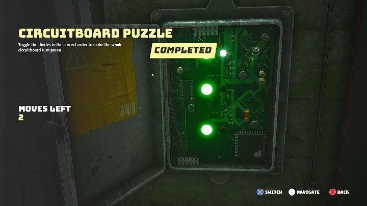 When trying to open the tunnel door, you will find a new type of puzzle - by changing the color of one light, you will also change the color of all adjacent lights. The puzzle will be solved when all the lights turn green.