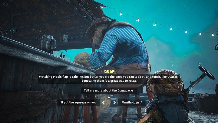 During the conversation, Goop will inform you that he has created a weapon that will be able to distract Porky Puff, but he needs special ammunition for it. He will ask you to find Gulp and ask him where you can find Gumquacks.