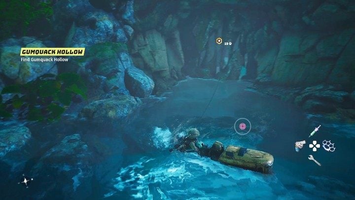 Swim to the location indicated on the world map, then hook over the rocks blocking the cave entrance and press the assigned button to destroy the obstacle.