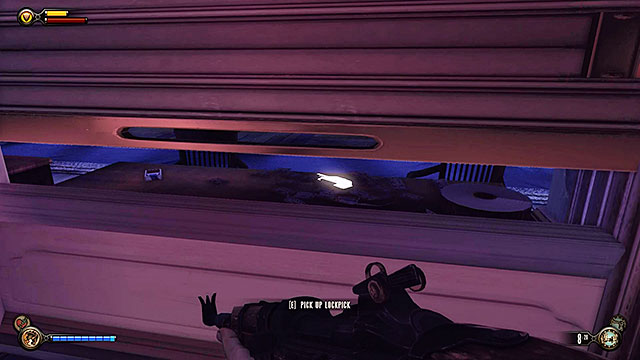 The room with the kinetoscope also contains a weapons upgrade station and a locked door. You can open this door assuming you still have 2 lockpicks with you. Wait for Elizabeth to break the lock and get to the ticket counter in order to collect a bag with silver coins and Gear #7 - Legs.