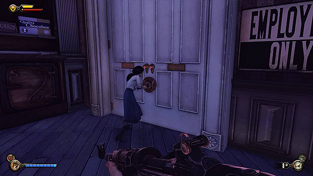 There's a weapons upgrade station at the end of the ticket hall, near a kinetoscope. Locate closed doors here and use 2 lockpicks to open them.
