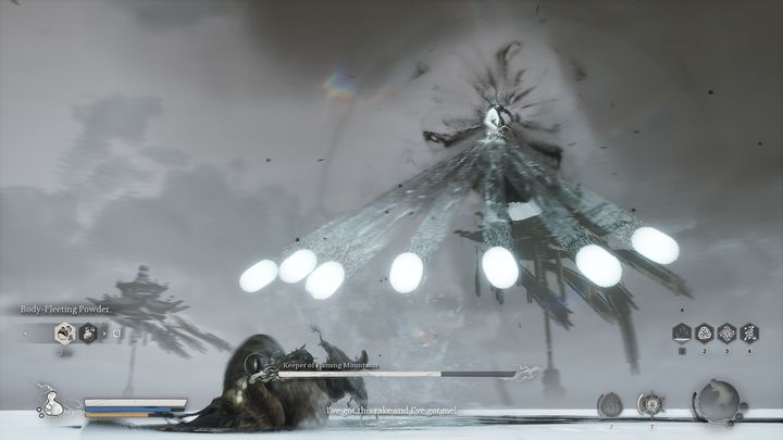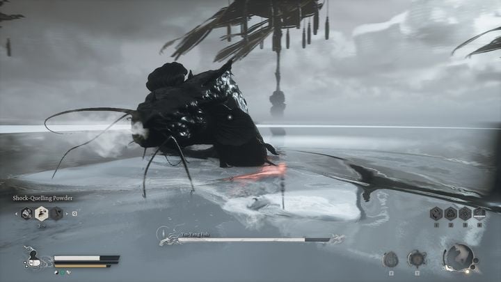 When the Keeper of the Flaming Mountains' health reaches very low levels, he will summon an inky black horse that attacks with a whip. His attacks have a large range, but despite the various blows, they are very similar. Most often he strikes three times. Be careful of one combination, because when approaching the enemy from the side, the third attack is barely visible and often hits the target. That's why you should always focus on performing three dodges in a row and only then attack him. When he is defeated, you will start the fight with Yin-Yang Fish.