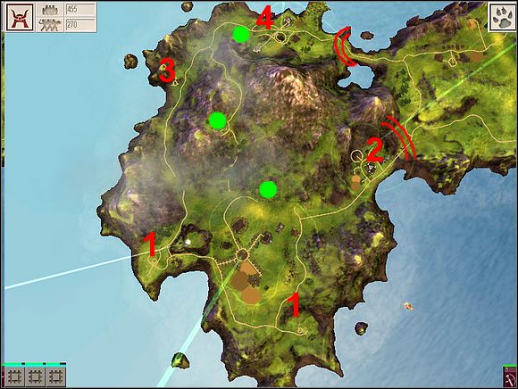 Once You've build up Your city and You posses at least two platoons with 50 soldiers each (not including the archers giving to You at the beginning), you can start expanding. First, send Your creature to eliminate the enemy platoons stationed in this region (except the archers, evade them). Conquer the first village (1) and thanks to the influence line which will appear, take care of the remaining archers with the fire miracle. After that, take over the next villages. First take over (2), and then (3) with the help of Your creature (clean out the road near the walls). A small part of Your army can be taken over by the 'Siren' magic, which the opponent possesses.