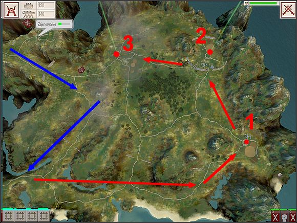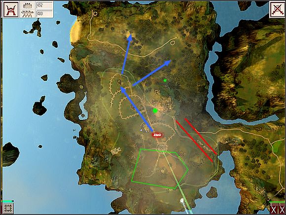 The blue arrows show the way which Your enemy will send his platoons onto Your city from time to time - watch out and don't let him surprise You - keep the gates to You capital closed and when his platoons will be near, destroy them with the fire miracle.