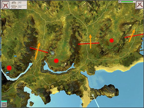 Conquer just as the arrows show, moving by the 'south' beachside. Always place Your creature on the front, his task is to clear the area, especially killing the enemy's platoons in the cities which You'll first take over.