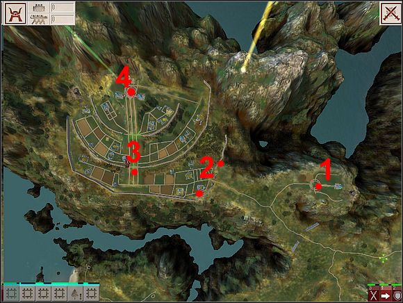 The last step to victory while being 'evil' is taking over Your opponents capital. For this attack, make a bigger army so that You'll have about 200-250 soldiers. First conquer the last village (point 1). Thanks to the influence line, heal Your troops and Your creature there. Point 2 shows where the wall is and the enemy archers that are stationed on it. Kill them using Your creature (if there is a need, retreat and heal him).