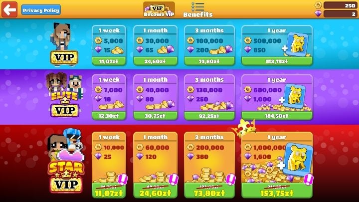 Remember that if you want to expand your wardrobe, you can purchase a VIP package. At the moment, there are three types of VIP memberships - regular, elite, and star.