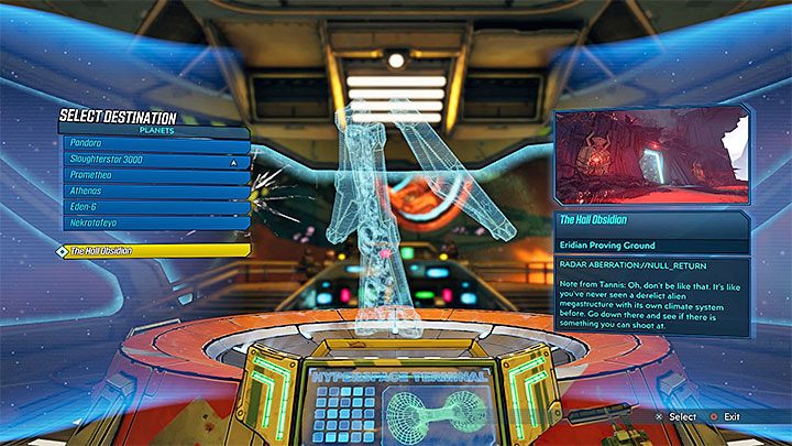 - Visit the Desolation's Edge region on the Nekrotafeyo planet. Locate the news board in the picture above and pick up the Welcome to Slaughterstar 3000 side quest. Return to Sanctuary and use the navigation computer. Fly to the Slaughterstar 3000 location.