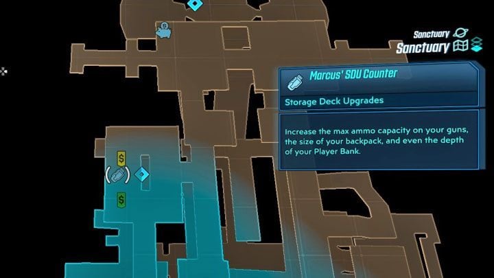 - Bank SDU - you can store more items in the bank on board the Sanctuary. It's a good place to store, for example, earned legendary items or weapons that you can't use yet.