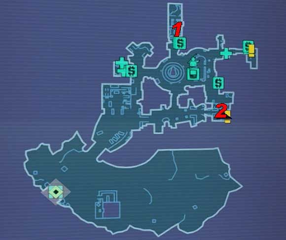 Head to Roland's hideout and speak with Tannis on the ground floor [1]. She will tell you of a group of fugitives who you should take care of. Firstly head to Moxxi [2] and pick up the Pizza from the screenshot.