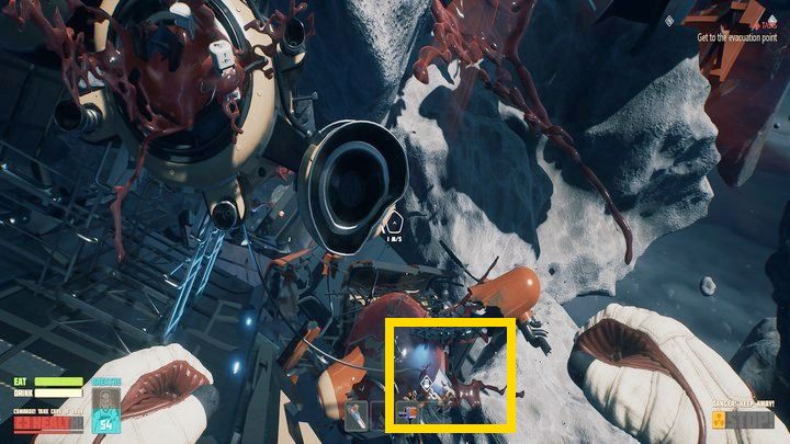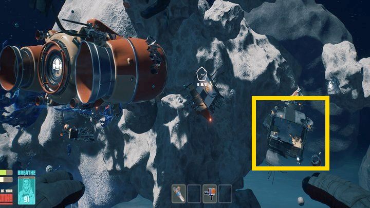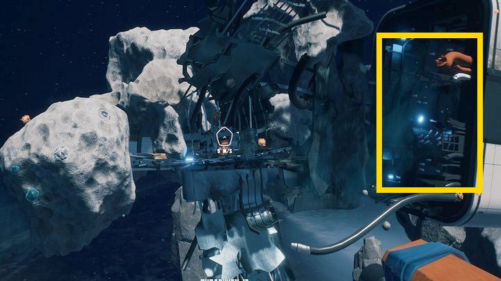 Notes a cow in a space suit is found near the biological module, floating in the space between the debris. Simply scan it with your scanner.