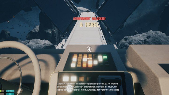 Notes: once you have entered the biological module and examined the contents of the consoles, you will be instructed to press the green button on the steering wheel console. You must choose the red button to unlock this achievement.