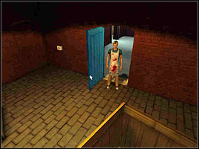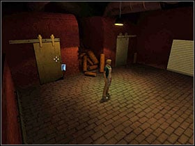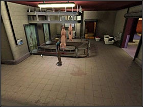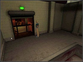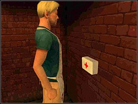 After a while you will see dead man [#113]. Rake his pockets and take magnetic card. Go to the "medicine chest" and using card open the secret passage [#114].