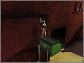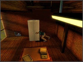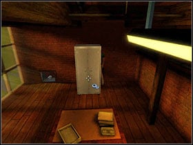 Climb onto the fork - lift truck and stand on the container. Look through the vent [#99]. Now you know, where is the manuscript. Go to the place, that you see on the picture [#100].